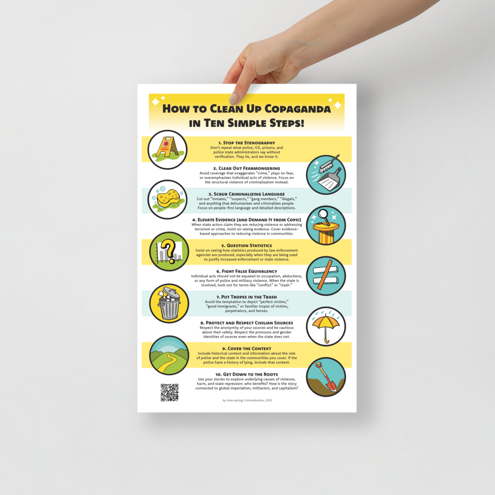 This poster, modeled after workplace safety posters that give advice on how to clean up vomit and other hazards, sums up ten key ways journalists and media makers can cut through authoritarian and pro-police propaganda by getting to root causes, avoiding sensationalizing, and refusing to repeat police lies. Great reminders to put above your desk or post in your newsroom! Text by Lewis Raven Wallace.